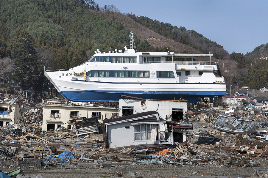東日本大震災の津波被害  岩手県大槌町の民宿の上に 打ち上げられた釜石市の観光船「はまゆり」(2011年4月18日)。 津波のすさまじさを象徴するシーンとしてハリス氏も取材。世界に向けて発信した ©Mark Edward Harris