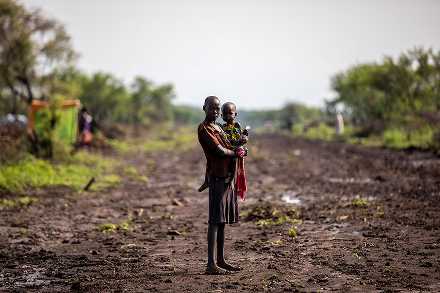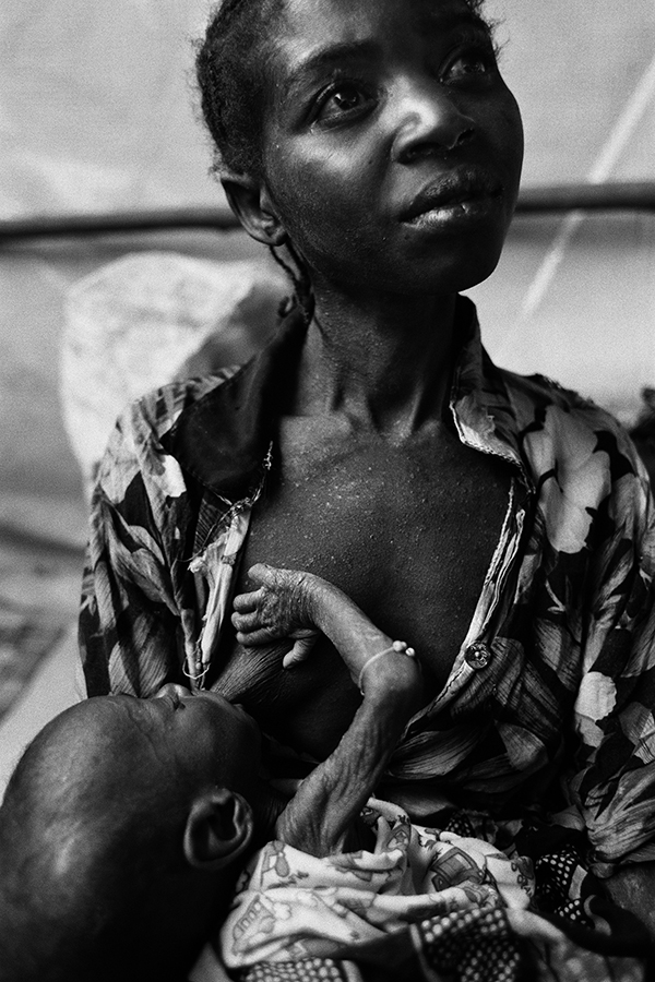 2回目の訪問時、「空白地帯」に入ることができました。栄養治療センターに瀕死の人たちがトラックで運ばれてきました。ほとんどが女性と子ども。大人は立っているのもやっと、子どもは力なく地べたに座り込んでいました。まさに餓死寸前の生きた屍でした。国境なき医師団の看護師がつぶやきました。「ここにいる人たちは強い人。弱い人たちはもう死んでしまったから」。その一人、ジョゼフィーナ・ディンカさんという23歳の女性に出会いました。7歳のトーマス君と、8か月の赤ちゃんジョゼ君も一緒でした。ジョゼ君の体重は3.2キログラムで健康児の半分以下、トーマス君の体重も16.2キログラムしかありません。母乳が出ないと身ぶりで訴えるジョゼフィーナさん。それでもジョゼ君はおっぱいに吸い付いてあきらめようとしない。そんな母子の必死な姿をファインダー越しに見ていると、人間という存在はとても弱いけど、強いと素直に思えました。矛盾した言い方ですが、人間の精神をぎりぎりのところで守っている何か、尊厳と呼ばれるものかもしれませんが、それに触れているような感覚がありました。彼女の強いまなざしが、人びとを長く苦しめてきた不条理の真実を語る証言となってほしいと、祈るようにシャッターを切りました。
