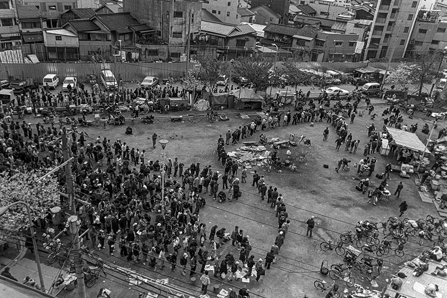 大阪の通称“釡ヶ崎”で、炊き出しの列に並ぶ人びと 渋谷敦志 撮影(1999年)