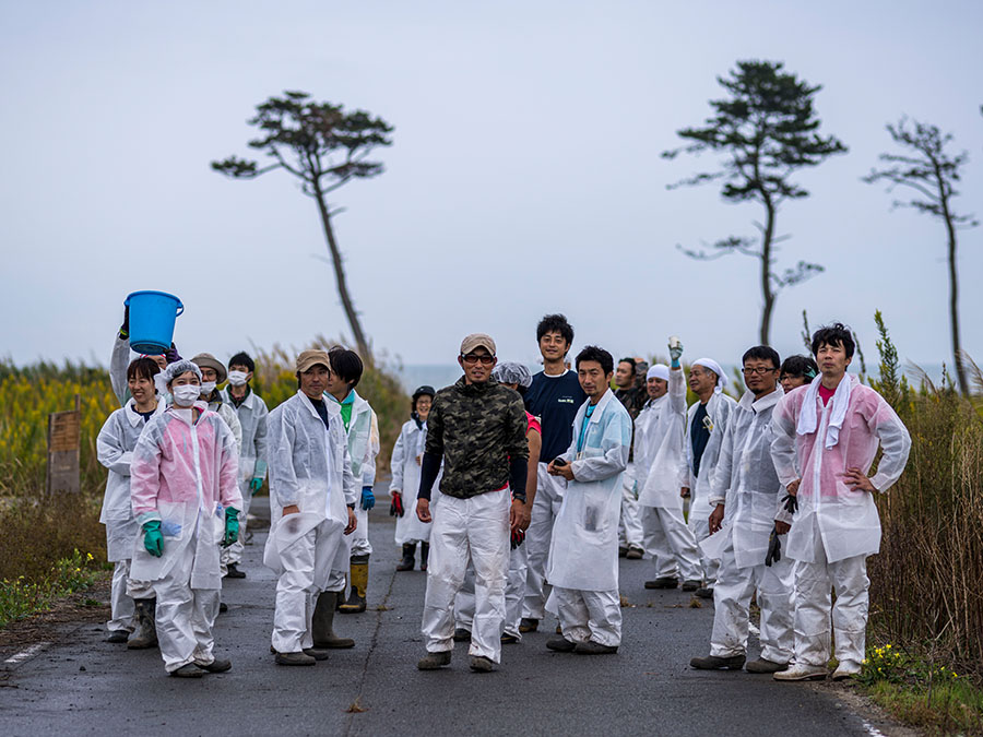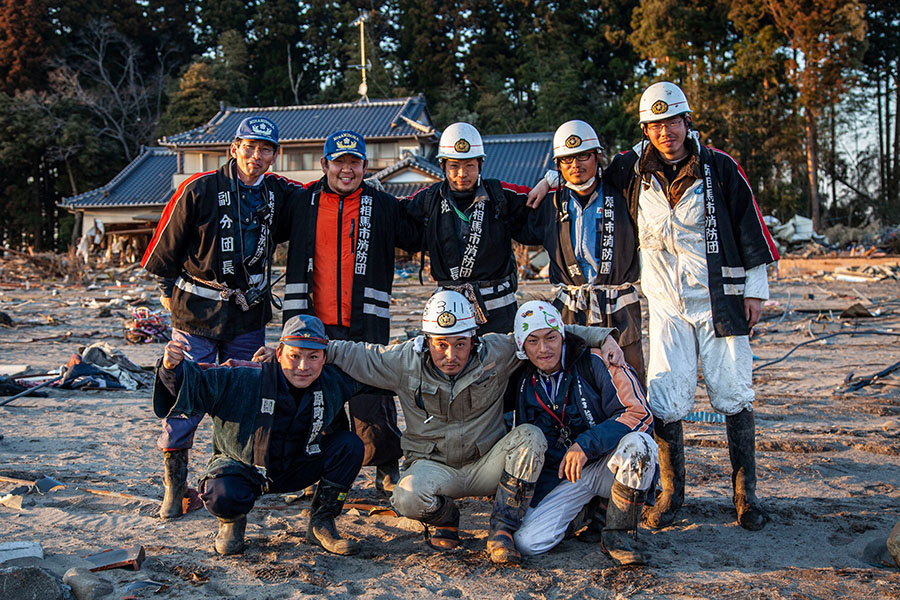 上野さんは、津波で母親と子ども一人を失ったこと、父親ともう一人の下の子どもが行方不明であること、原発が爆発して、住民が避難する中、消防団員の自分は、残って行方不明者を捜し続けていることなどを淡々と話してくれました。その後、日が暮れ始め、捜索活動を終えた消防団員らが上野さんの自宅前に戻ってきました。そこで、突然、上野さんから言われたのです。「おれたちの集合写真撮ってよ。記念写真。おれの家の前で」。震える指でシャッターを押し、構図を整えながら撮影しました。続けて7、8枚、撮ったでしょうか。ファインダーの中をじっくり見て、人の顔に目を凝らすと、男たちの眼がなんとも澄みきった感じがして、はっとしました。何かが写ったと。そんな手応えにぼくは身震いしました。結果的にですが、この時の写真は、あの時あの場所で「地獄」を共に生き抜いた男たちの唯一の記録でした。その一枚の写真が縁となって、上野さんとの関係が始まりました。その縁は今日も大切にしてます。父親と息子はまだ見つかっていません。「見つけ出して早く抱きしめてあげたい。どういう状態であっても、抱きしめて、謝りたい」。それが上野さんの1番の願いとなっていました。