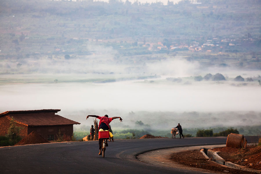 かつて虐殺を逃れた難民が歩いた道を自転車が駆け抜けた。ルワンダ、キガリにて 渋谷敦志 撮影(2007年)