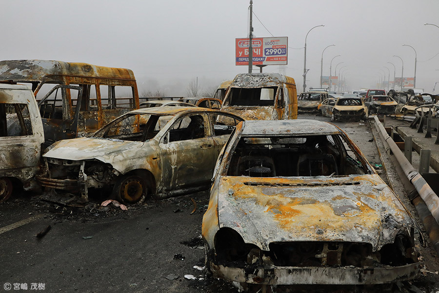 この町を占拠中のロシア軍車両がウクライナ軍の反撃で全滅した。この通りは、ロシア軍の車両の残がいのみならず、ロシア、ウクライナ両軍兵士と町民の死体で埋め尽くされた。