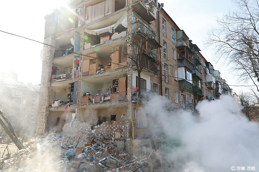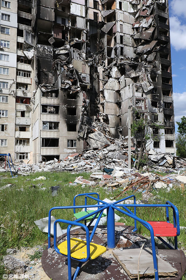 地区でひときわ高層のこの集合住宅は、ロシア軍のかっこうの標的となり、全フロアが灰塵に帰した。子どもの笑い声も消えて久しい。この集合住民に住民が戻る日は遠かった。