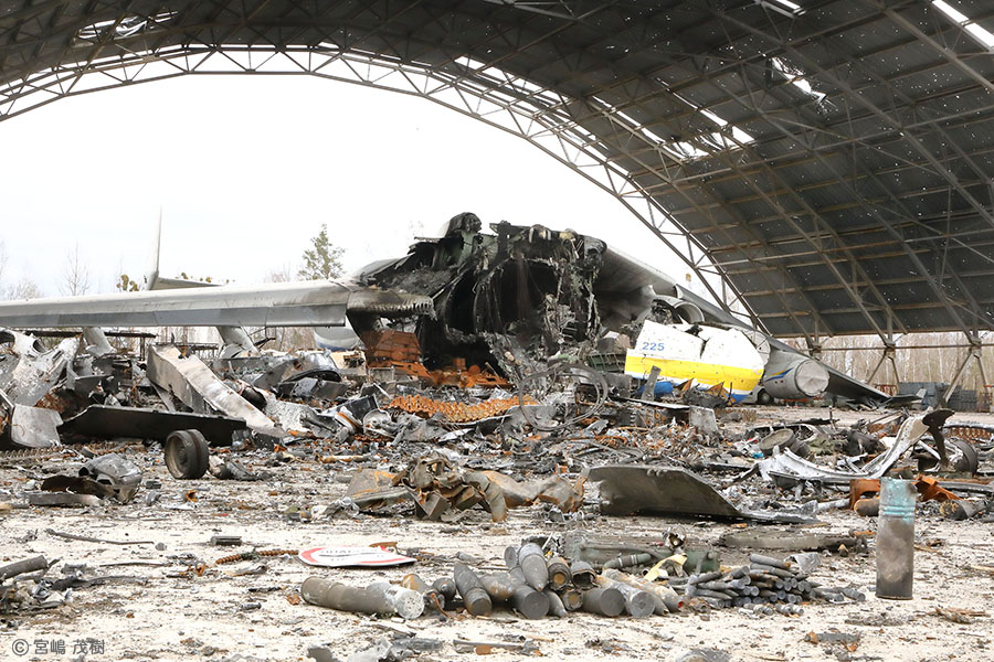 エプロンには無数の不発弾や爆発物が散乱。格納庫の天井もススで真っ黒な上、蜂の巣状態だった。この地でくりひろげられた激戦ぶりがうかがえた。アントノフ社は「ムリー ヤ」の再建のため国際基金を設立、それは目標額に達しつつあった。
