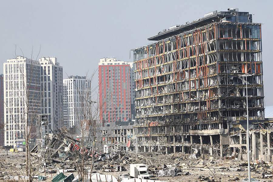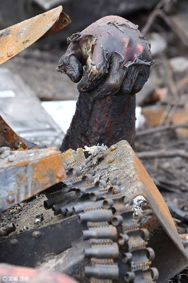 壁側面が崩落した集合住宅。黙々と焼け焦げた本を処分する2階右側の部屋に住む老人の姿まで丸見えだった。