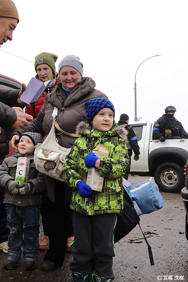 野蛮なロシア軍に囲まれ恐怖の日々が1か月以上つづいたのである。ボランティアのおじさんから渡されたジュースパックを抱きしめると、ようやく笑顔がもどった。