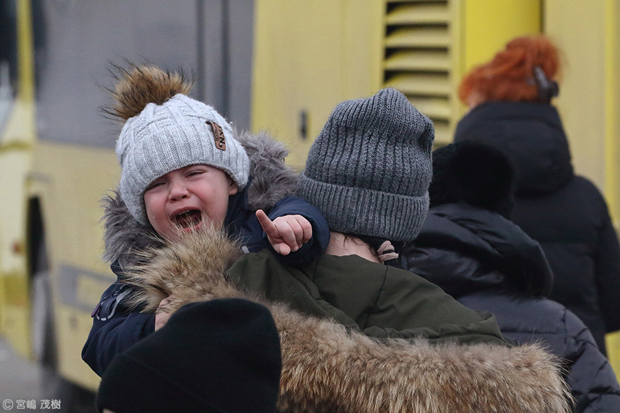 激戦がつづいたイルピン市から、工兵部隊のトラックの荷台に乗せられ、イルピン川まで避難してきた三世代家族。