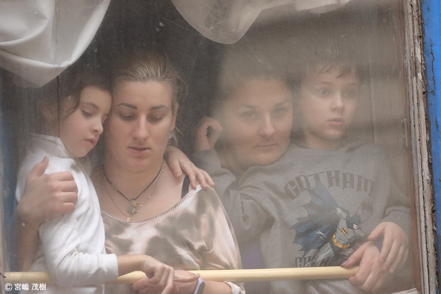 車窓から見える戦禍の祖国は、この家族の目にはどう映ったのか。今度いつ帰れるかも知れぬ祖国の大地をまぶたに焼き付けようとしているように見えた。