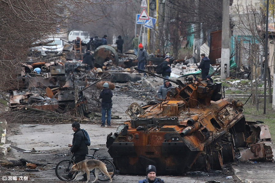 ロシア軍部隊が全滅した通りとしても有名になったここには、他の町からも市民が訪れ、記念写真に納まりだした。しかしロシア軍の車両は工兵によりすぐに撤去された。