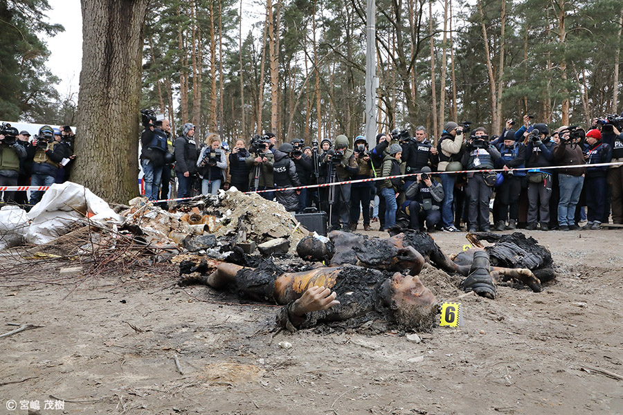 この町では数々のロシア軍による戦争犯罪の証拠が見つかった。また、郊外の林の中では、ゴミといっしょに身体の一部が焼かれた成人二体、子供四体の死体が発見された。成人二体は骨格から明らかに女性に見えた。