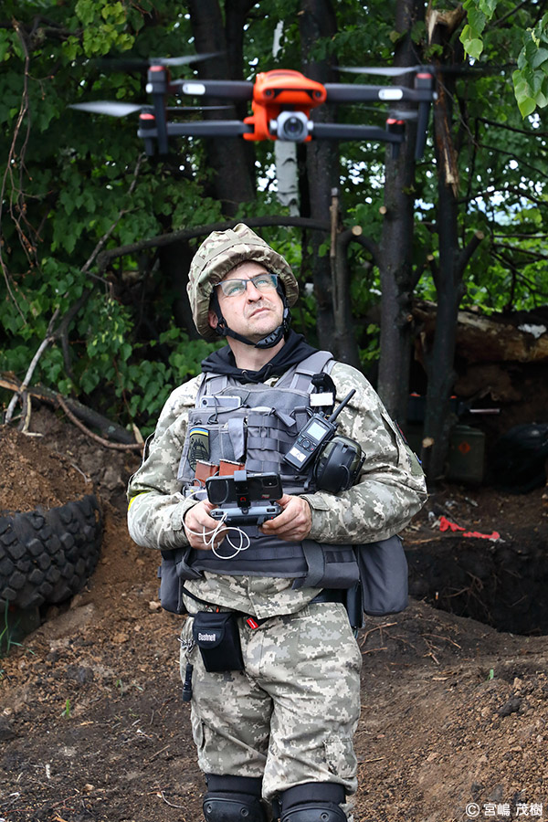 ロシア軍侵攻前もドローンオペレーターだった偵察小隊の「マックス」。ドローンをテイクオフさせたら、あとは電池が続くまで林の中で身を隠しながらドローンをコントロールする。