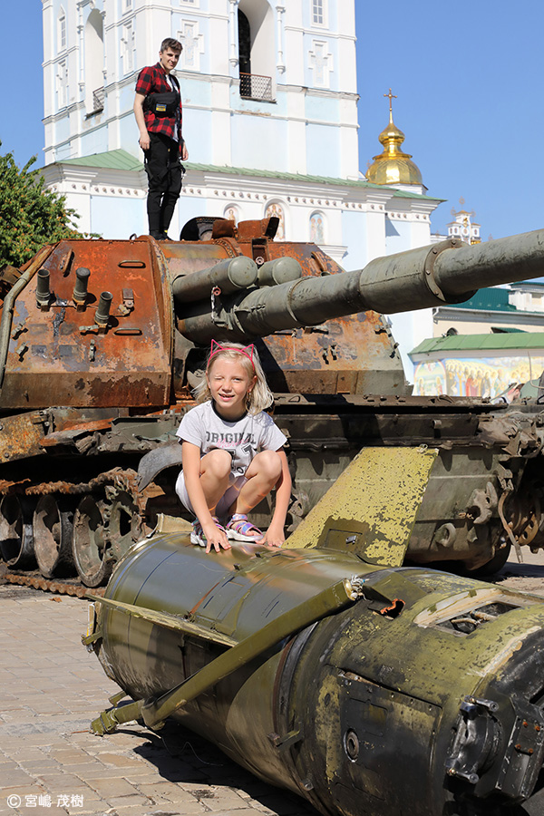 砲身は平均台に、自走砲はジャングルジムに変わり、T―72戦車内は、かっこうの 隠れんぼの場に。首都には久しぶりの子どもたちの歓声が戻った。少女が腰かけるのもロシア軍の巡航ミサイルである。