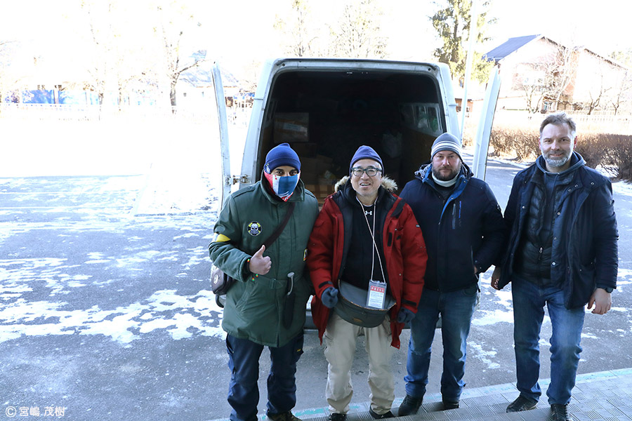 足は医療支援物資を運ぶ救急車。同行したのは現役の外科医イゴール(右端)と運転手。道中、百回以上あった検問所(チェックポイント)を乗り切れたのは、彼らの協力と、日本の旅券(パスポート)と、首から下げたJPS発行の国際プレスカードのおかげだった。