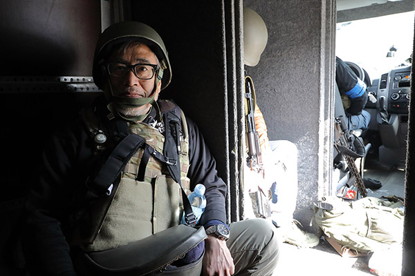2022年3月、ウクライナ領土防衛隊装甲車で最前線に向かう筆者。防弾装具の調達には苦労したが、これらの着用が従軍の必須条件だった。