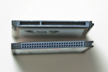 従来のCompactFlashカード(下)とCFastカード(上)コネクターの違い