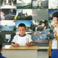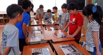 1回目は、教室でフラッシュを使い集合写真や人物撮影を行い、校庭に出て遊具を使って人物スナップを行った。校内で数枚を撮影して残りを児童たちが考えた「私の好きな風景」をテーマに撮影することにした。この地域は瀬戸内海に山がせり出し平地が少なく谷間に集落が密集している。また、大型船の造船所もある。印象的な写真には、海岸に沿った県道の先に造船所を入れた写真や山間に密集する住宅地など、地域の特徴をとらえた写真があった。児童からは、「どこを撮ろうかと悩んだが、それを決めるとよい写真が撮れることがわかった」と感想があった。