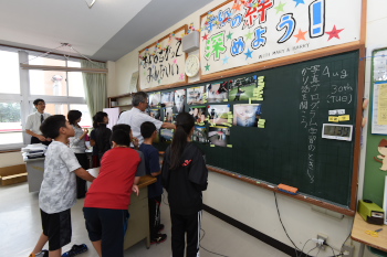 1回目の授業は7/20に行い、写真を撮る時の気持ちやカメラの使い方をレクチャーする。芝桜で有名な街にある学校で、レクチャーの後、校区内の公園に試し撮りに行く。
