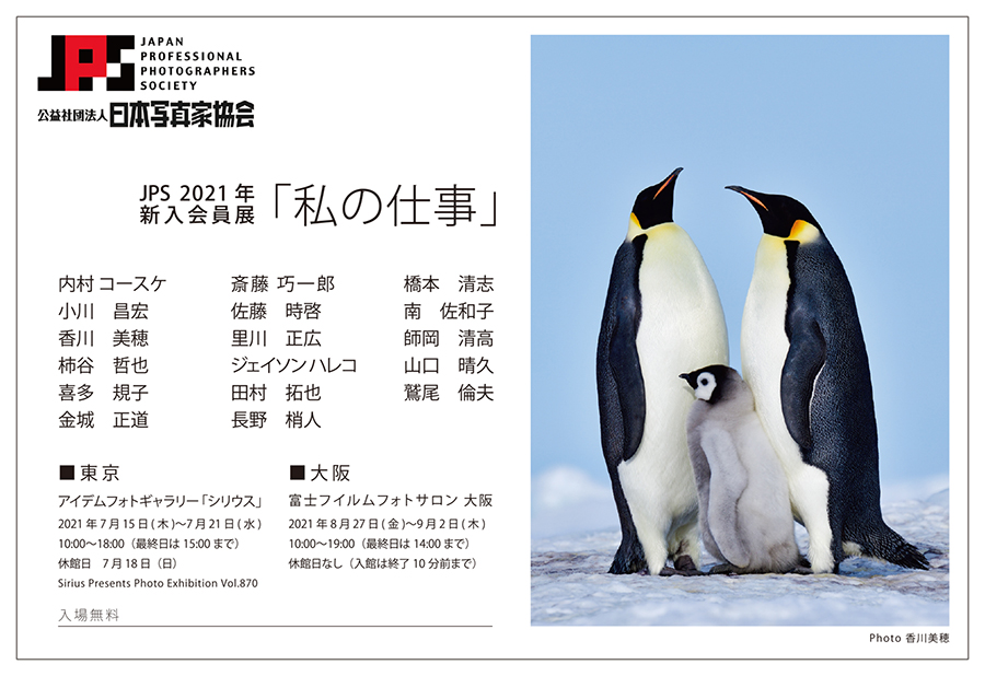 公益社団法人 日本写真家協会(会長 野町 和嘉)は、現在プロ写真家1,374名を擁し、種々の活動を行っておりますが、その事業の一環である、恒例のJPS2021年新入会員展「私の仕事」を開催いたします。今年入会した様々な分野で活躍する17名が出展する、彩り豊かな会員展となります。ドキュメンタリー、コマーシャル、風景、人物など、それぞれの専門分野を活かした作品、1人3点の計51点(カラー・モノクロ)を展示いたします。写真家が何を見つめ、どう写真と向き合っているのかを感じ取っていただけたら幸いです。
