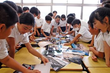 1回目の授業でスライドを使って上下左右のアングルで写真の雰囲気が変わることを説明して撮影に入った。ストロボ撮影や教室のベランダから広さを写し、校庭に出て低いアングルから笑顔のスナップ撮影を行った。残りを自由課題にしたが、江田島は牡蠣養殖が盛んで、牡蠣棚や海の写真が多くあり、考え楽しんで撮影した様子がうかがえた。児童からは、「デジタルカメラと違ってフィルムカメラは、枚数が限られて撮りたいものを選ぶ楽しさがある」。「どのように写っているか楽しみだった」。「撮る方向や角度で同じ写真でも違うことが分った」などの感想があった。