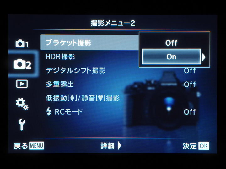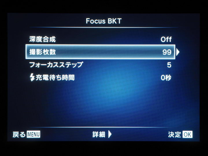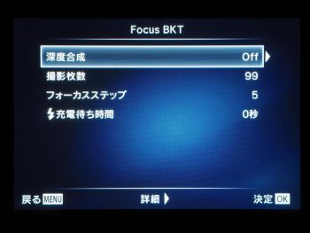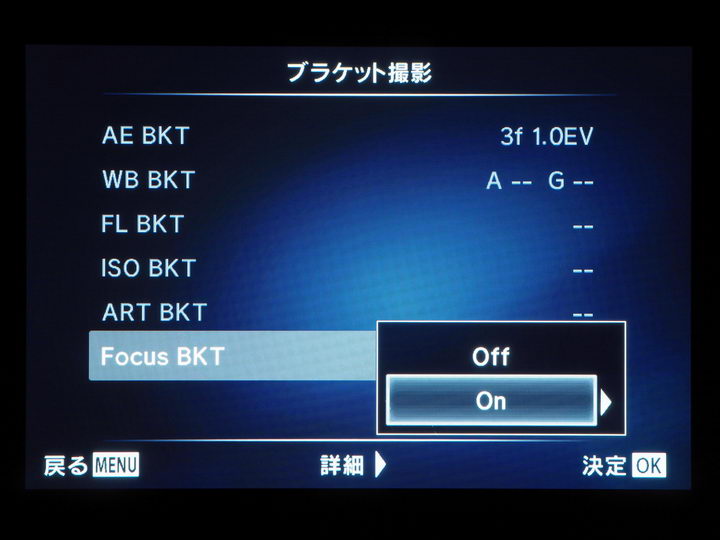 設定時に気になったのが“メニュー階層の深さ”。撮影メニュー2→ブラケット撮影:OffからOn→(6種類のブラケット機能)→Focus BKT:OffからOn→撮影枚数、フォーカスステップを選択→数値設定。……と、実際に操作してみると、撮影枚数やフォーカスステップの設定画面に到達するまで、結構な手間(操作)が必要になる。
