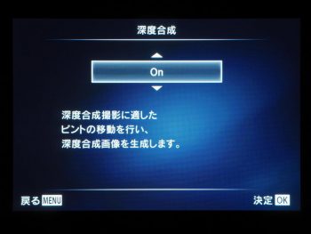 フォーカスブラケットと同様「撮影メニュー2」から設定をおこなう。撮影メニュー2→ブラケット撮影:OffからOn→(6種類のブラケット機能)→Focus BKT:OffからOn→深度合成:OffからOn。また、Focus BKTの階層内で、撮影枚数とフォーカスステップの数値設定もおこなっておく。
