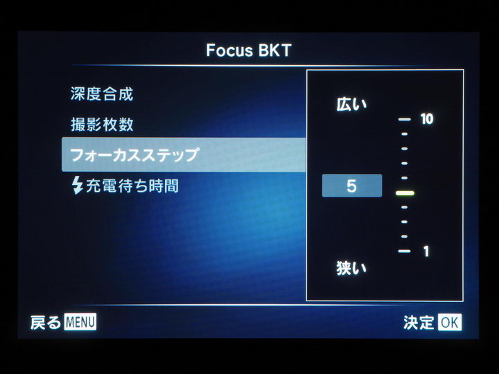 撮影ごとのピント位置の間隔を調整する「フォーカスステップ」は、フォーカスブラケット時と同様、深度合成のモードでも、重要な設定項目になってきます。フォーカスステップの初期設定値は5ですが“1~10”の間で設定できます。そして、小さい数値ほどピント間隔が狭くなり、大きい数値ほど間隔が広くなります。そのため、合成画像の被写界深度をより深くするには、大きい数値に設定する必要があるのです。