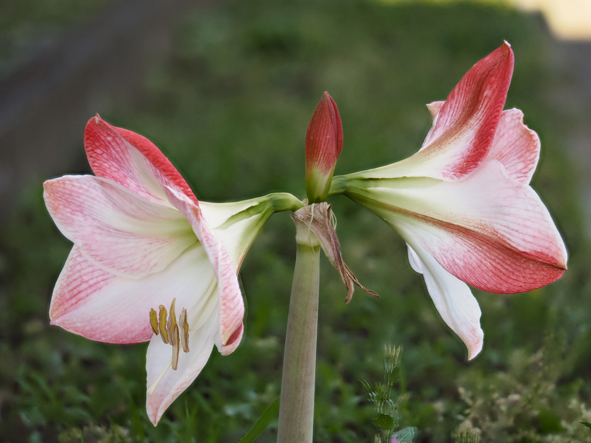 M.ZUIKO DIGITAL ED 60mm F2.8 Macroを使用して、奥行きのある2輪のアマリリスを撮影。絞りは開放のF2.8に設定。「深度合成」モードにより、手前の花(左)から奥の花(右)までハッキリと描写することができた。しかし、花の輪郭部分には、複数カットの輪郭の残像らしい痕跡が見られ、アマリリスの茎の右に位置する小さな植物も、風による大きな揺れが原因で、複数の像が重なる不自然な描写になっている。