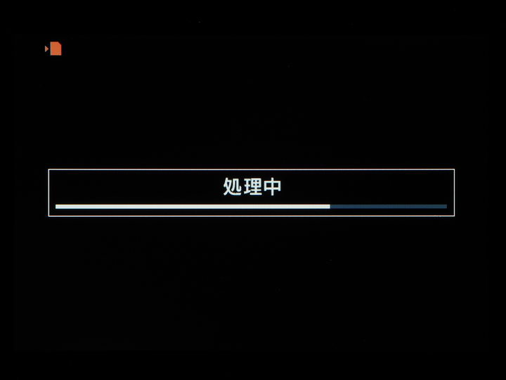 撮影後の画像処理中の表示。画面の左上には、メモリーカード書き込み中の表示(点滅)。 |