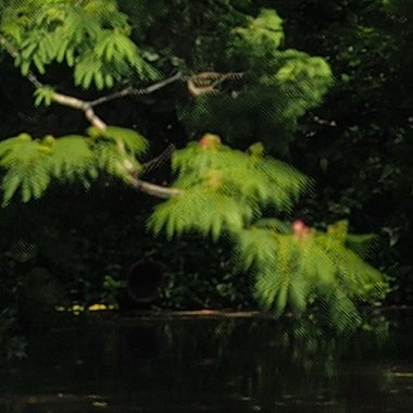 では、今度は動きのある所の部分切り出しを比較してみます。ここでも同じ範囲を切り出しますが、ハイレゾショットによる描写の変化が見やすくなるよう、リサイズせずに掲載してみます。切り出したのは、日陰を背景にしたネムノキの枝で、風による揺れが見られる部分です。とはいえ、通常なら低速シャッター(1/30秒以下とか)でもない限りブレが目立つ事はないでしょう。ここでも「1/160秒」という十分な速度です。しかし、ハイレゾショットの8枚撮影の最中に風によるズレが生じ、合成処理の結果、その部分が低速ブレのような描写になっているのです。しかも、低速シャッター時のような被写体ブレではなく、まるでゼブラパターン(輝度オーバーによる白飛びが起きる範囲を示す、液晶モニター上の表示)のような規則的な斜め線が発生しています。