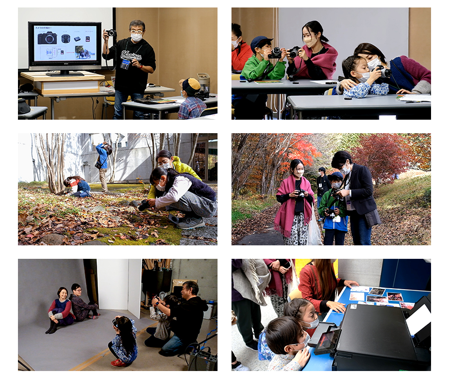 2021年11月7日(日)、標高1000mを超える清里高原の涼やかな空気と、美しい自然に囲まれた清里フォトアートミュージアムにて、「おやこ写真教室」を開催しました。参加者は、山梨県在住の方をはじめ、東京都や神奈川県から総勢8組16名。最初に、1人1台ずつ貸し出した富士フイルムのカメラX-S10の使い方を学び、次の野外撮影では、ちょうど見頃を迎えていた紅葉、色とりどりの落ち葉、小さな草花などを思い思いに撮影し、参加者の楽しそうな声が森に響き渡りました。また、室内スタジオでは、大型ストロボで本格的なライティングをセットし、親子で撮り合うポートレート撮影を楽しみました。大光量のストロボが光るたびに、子ども達は興味津々。最後は、それぞれの作品をモニターに映し出して講評、そしてお土産用の作品写真をエプソンプリンターEW-M873Tでプリントしました。プリント中は、出口の奥を覗き込んでは、出てくるたびに「わー!」と歓声があがるなど、終始笑顔の絶えない写真教室となりました。今後のおやこ写真教室に大きな可能性を感じるイベントとなりました。