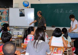 写真に興味を示してもらう目的で自分の作品パネル数点を展示し、プロ写真家の撮る写真を見せた。さらにその作品を撮った4×5カメラを見せてカメラの構造や写真の写る原理を説明した。その後レンズ付きフィルムの使い方を実技指導。今のデジカメとは違い、写した結果がその場でわからないことが、むしろ子ども達には刺激があるのか夢中でファインダーを覗き被写体を探す姿が印象的だった。2回目の作品講評ではみんなの撮った写真を見ながら、写真は記憶を記録する事のできるツールで、他人と場所・時間を越えて見た物やその時感じた事を共有できるとことを理解させた。
