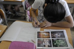 2回目、早速仕上がったL判プリントを手にして、撮影時と写真の印象の違いを先ず作文、撮影データを記録しながらアルバム制作にかかる。作品発表では児童の作品説明に足して、良かった点を講評した。楽しい写真の見方を得たようで、授業後も次々感想をもとめる児童と話し合うこととなった。