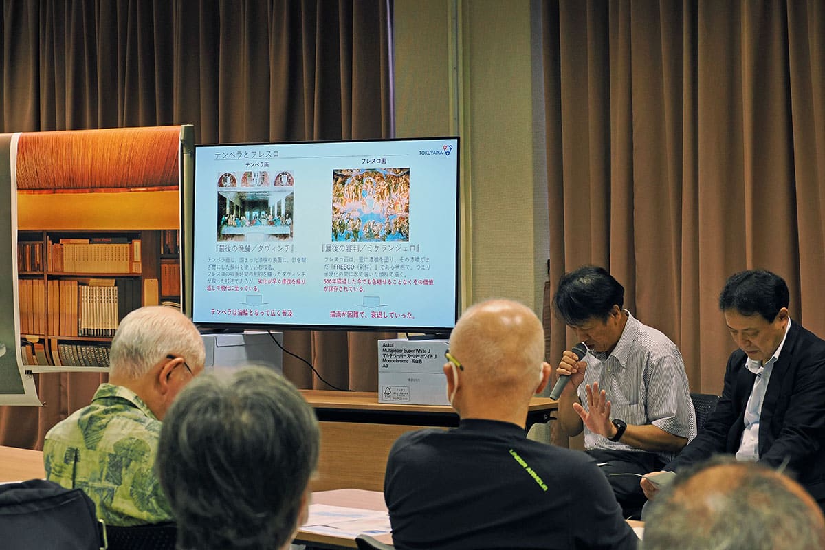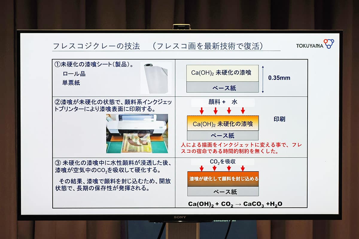講演者のテーブル横に設置された大型モニターも使用しながら、フレスコジクレーを紹介。古典的なフレスコ画法に続き、具体的なフレスコジクレーの技法や、2種類の未硬化の漆喰シート(製品)のテクスチャーの違いなどの解説が行われた。
