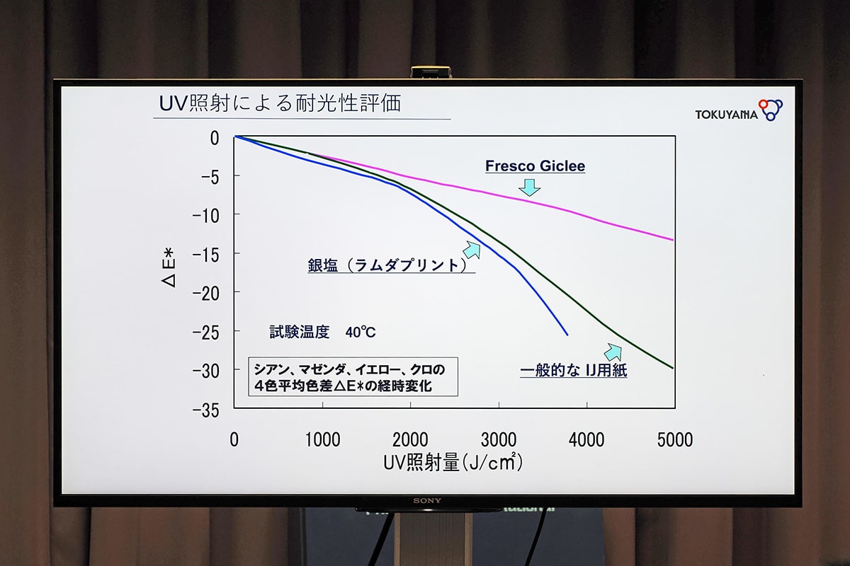 4色の顔料インク(シアン、マゼンタ、イエロー、ブラック)を使用し、プリント用紙ごとの耐光性試験を実施。一般家庭屋内での100年間に相当する量(5000J/c㎡)の紫外線を照射し、その間の退色具合をグラフで比較したもの。銀塩(ラムダプリント)や一般的なインクジェット用紙(マット紙)に比べ、フレスコジクレーの退色度合が緩やかなのが分かる。
