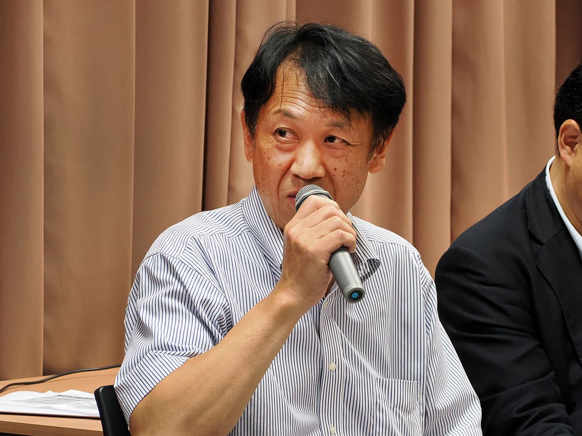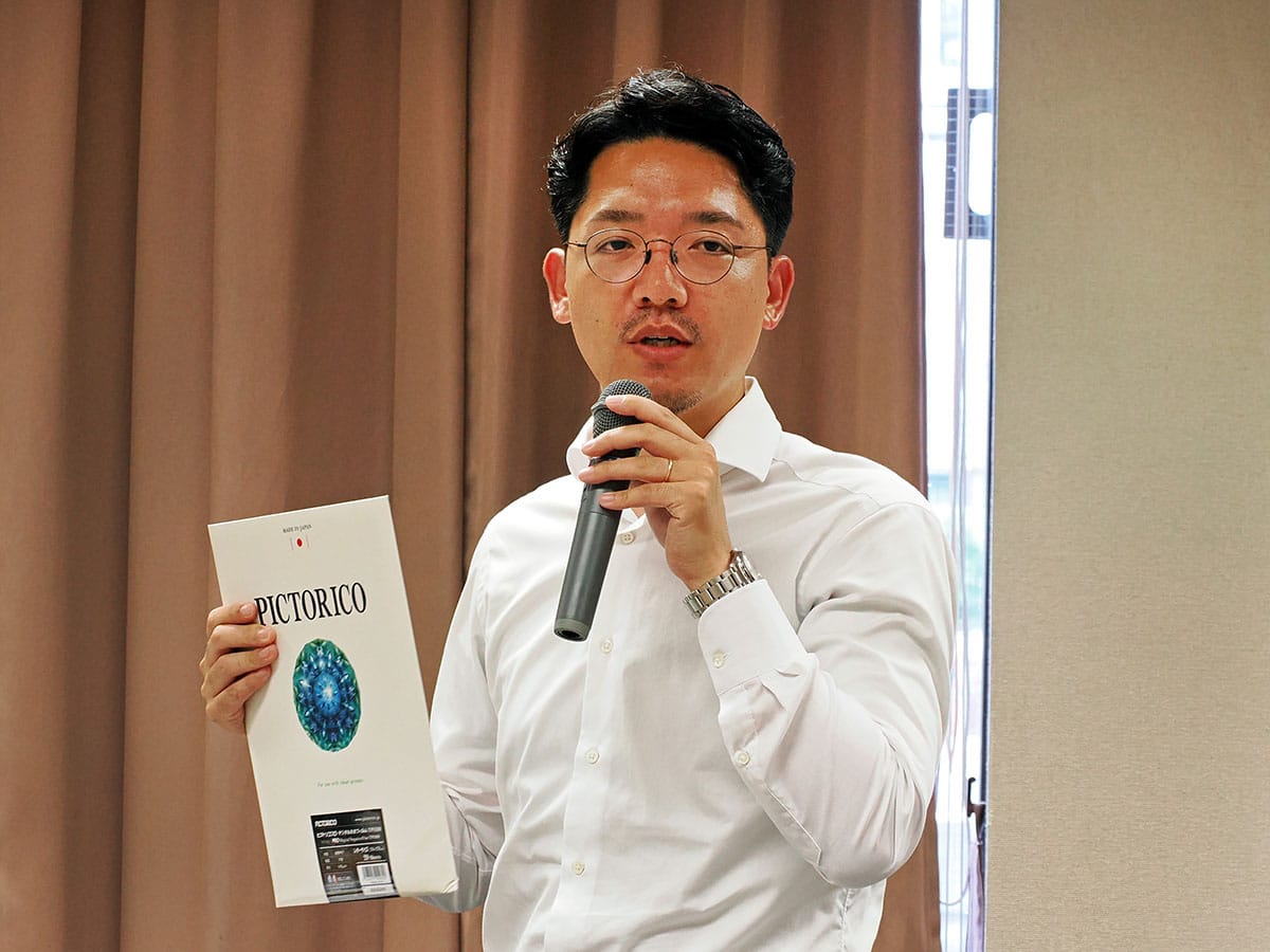 フレスコジクレー製品を販売する、株式会社FLトクヤマの田中敦史氏が挨拶。続いて、その製品を製造する株式会社トクヤマの東伸彦氏から、フレスコジクレープリントについての解説がありました。