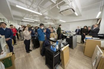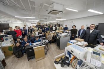 写真展などの展示施工を手掛ける企業はいくつかあるが、フレームマンは社訓の中で「価格競争はしない」と宣言するように廉価でお手軽ではない。それでも、個展を何度となく開催した会員の一人は「展示施工を手掛ける会社はフレームマンかそれ以外かしかない。フレームマン以外に依頼した時にその真価が分かる」とフレームマンのトータルでの展示施工レベルの高さを実感したという。 個々のスタッフは技術だけでなく接客も含めて丁寧で行き届いているが、その裏には奈須田社長の「スタッフファースト」が息づいている。朝礼で「初孫おめでとう」と奈須田社長が声をかけ場が和んだ。奈須田社長はスタッフをファミリーと呼ぶ。