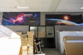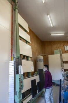 大型作品への対応も充実している。社屋裏側に増築された工房には東京都内最大級のパネルソーを設置し4メートルまでのアルミ複合板や板材を切断することが可能だ。