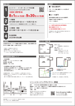 ソニーイメージングギャラリーでは写真展開催ご応募を受付中です。締切は2019年9月30日(金)15:00までとなります。写真展開催ご希望の方のご応募をお待ちしております。締切間際は混みあいますので、お早目のお申し込みをお願いいたします。