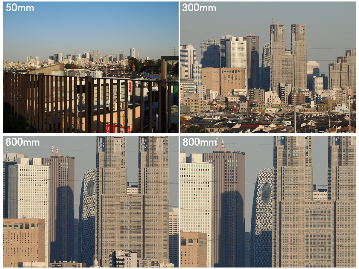 約4.5km先の新宿超高層ビル群を望む。標準の50mmと比べると、300mmでもかなりの望遠効果が感じられる。そして、600mmや800mmの画面になると、肉眼では気が付かないような細部の様子も確認できるようになる。