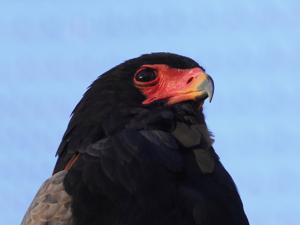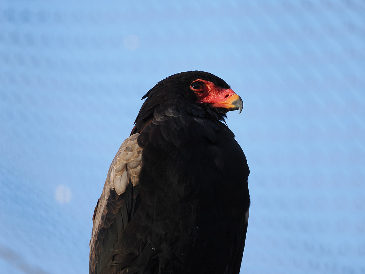 木の頂上に止まっていた、赤い顔が特徴的なダルマワシ。その姿を柵越しに800mm相当(実焦点距離400mm)の望遠端で切り取る。このくらい大きく写せれば、特徴的な表情や毛並みなどがよく分かる。なお、周囲のボケに独特な模様があるのは、背後にあるネットの影響によるもの。