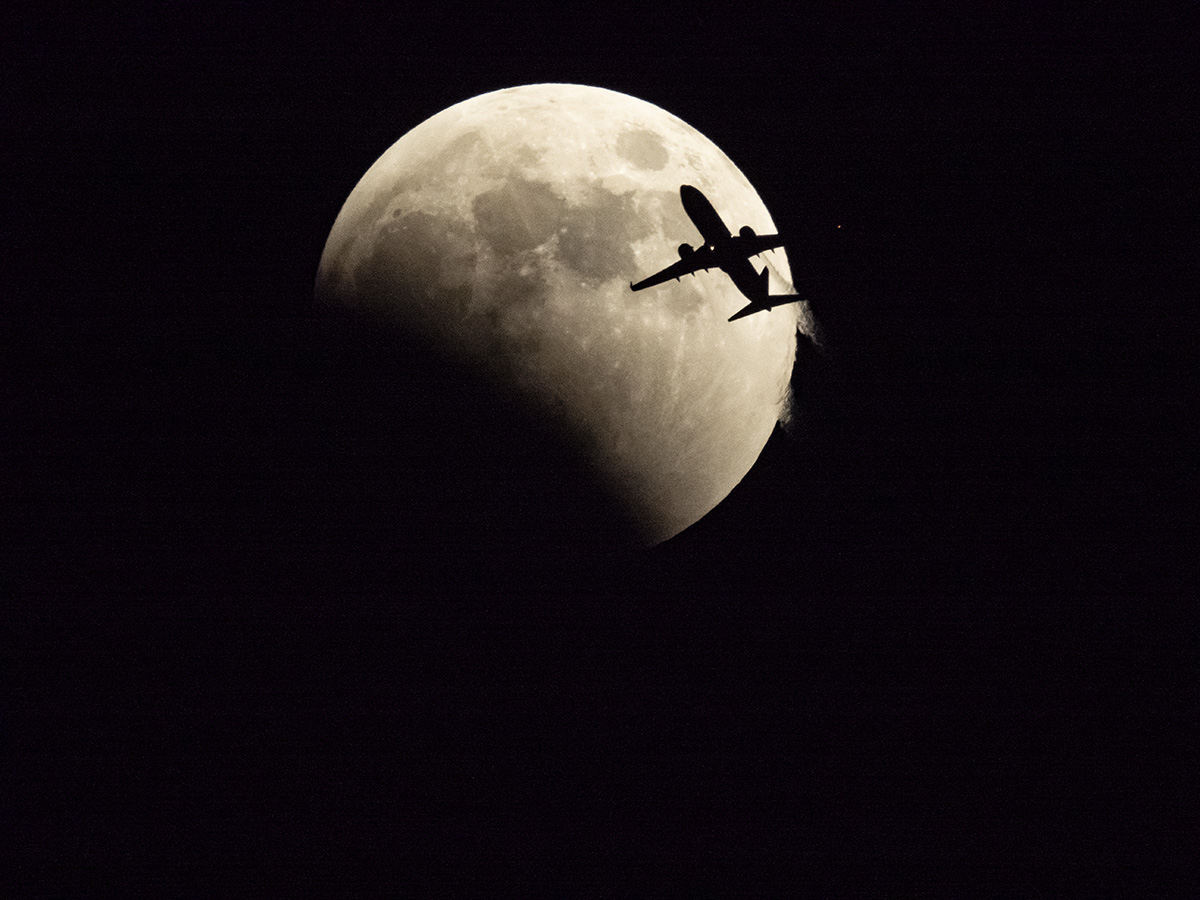 2022年11月8日の皆既月食の際、途中の“部分食の姿”と、飛行機のシルエットが重なる瞬間を捉えたもの。200mmや300mm相当の望遠で狙っても意外と月は小さく感じるし、飛行機のシルエットは粒のような存在だろう。しかし、2倍のテレコンバーター装着による1600mm相当で狙うと、月の表情や飛行機の存在感が十分感じられる写真に仕上がった。