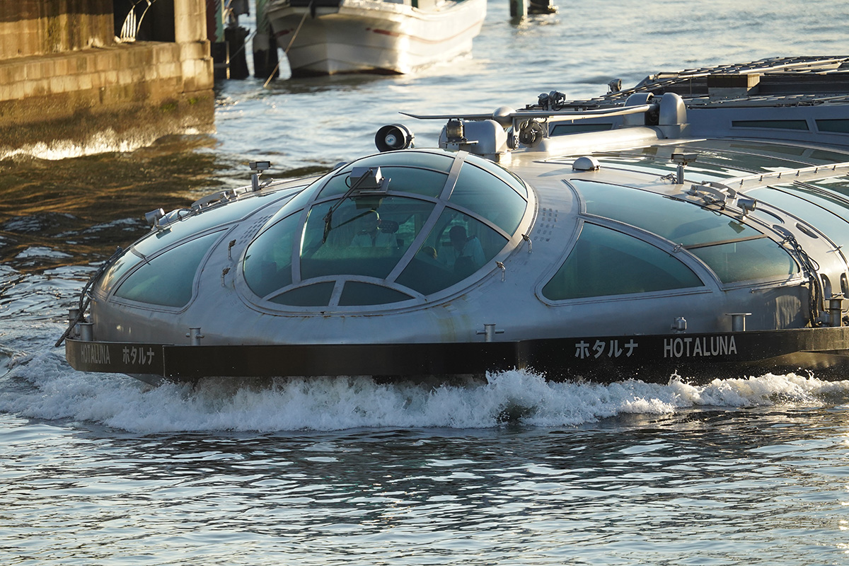流線形デザインが特徴的な水上バスが、遠方からこちらに向かって航行してきた。逆光に近い光線状態で浮かび上がる独特なフォルムや船首の波頭をポイントに、600mmの超望遠域で切り取る。高速シャッターを得るため、絞り値は必然的に開放(F6.3)になったが、それによる描写の破綻は見られない。