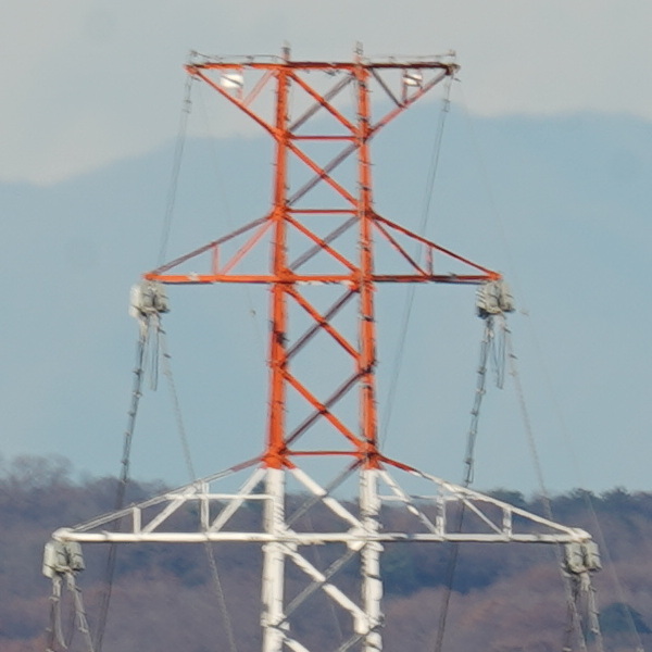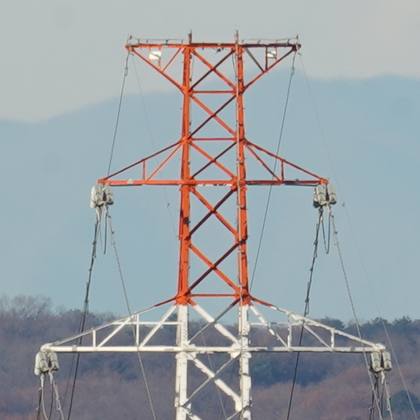 山道の中腹に三脚を据えて、600mmで画面中央の鉄塔にピントを合わせて(MFで拡大確認機能を使用)撮影。設定シャッター速度は1/30秒。そして、その画像の中央部分を切り出してみる。