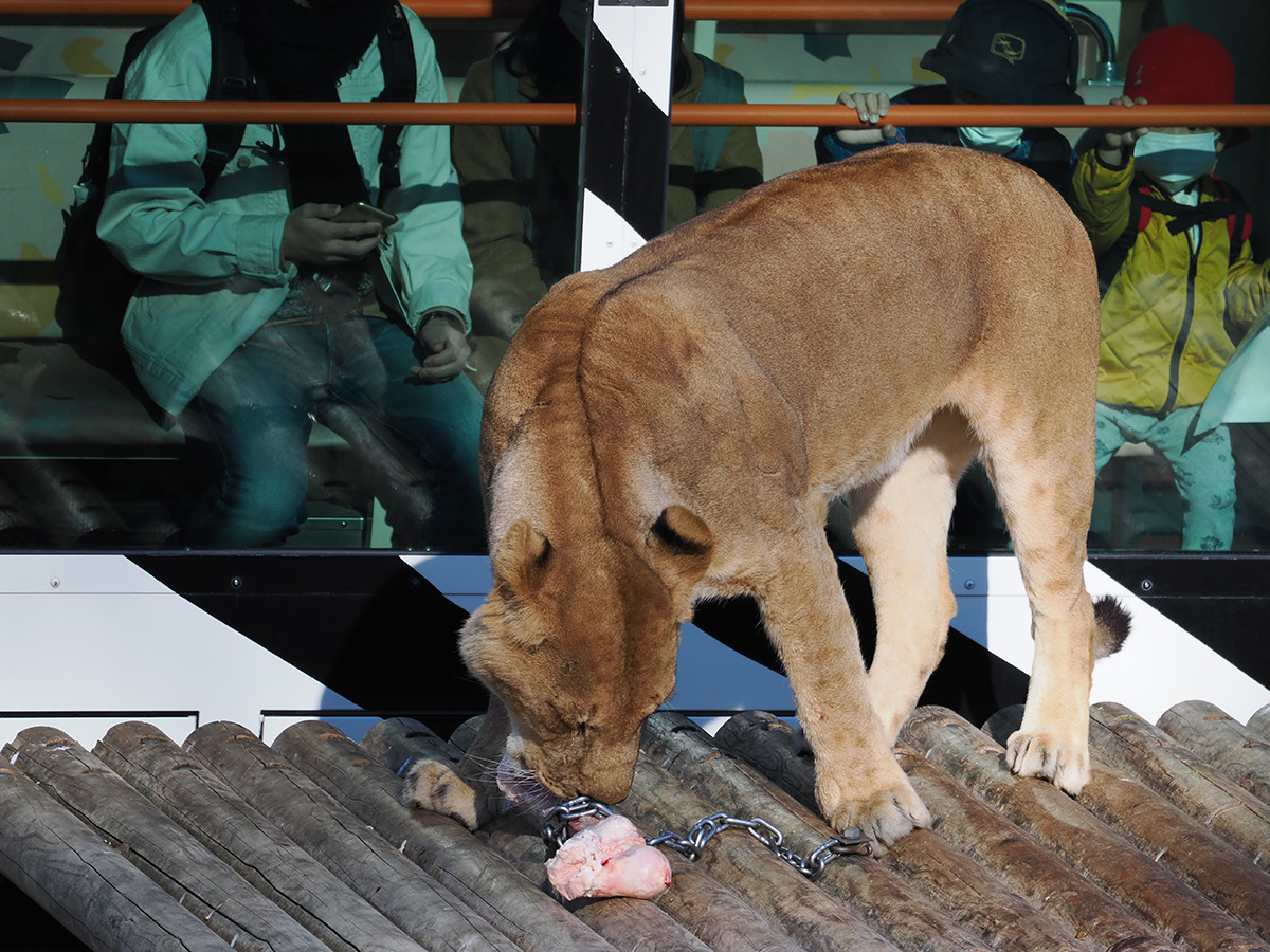食事中のライオンと、それを間近で観察するライオンバスを絡めて撮影。自分とライオンまでの距離は35mくらいだろうか。その間合いの被写体を800mm相当で狙うと、50mm相当の標準レンズで“2m強”の距離から撮影した場合と同じ大きさに写る計算になる。近づけない被写体のリアルな姿が写せる訳だ。