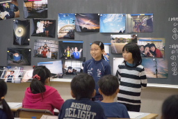 児童には、1回目の授業を行った10月下旬にカメラを預けた。市内の街路樹は紅葉し、ハロウィンイベントが行われていた。2回目の授業は出来上がった写真を前に行った。一人ずつの時間と空間を切り出した写真が教室に溢れた。写真を黒板に展示するグループ、光があふれる窓側のガラスを選ぶグループ。掃除用具箱が置かれた廊下側の壁に並べるグループ。その空間になんの制約を感じることもなく写真展会場を設営する児童の姿。一人ずつが撮影した時の心情、作品を前に語る。小生は写真の全てにきらっと光る一点を見つけ伝えた。その瞬間に児童の表情がぱっと明るく、輝く瞬間を見逃さなかった。(記・撮影/鷹羽金藏)