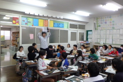 2回目は児童が撮った中から四切ワイドにしたものに講評を交えながらタイトルを考えてもらった。撮った時見たものと仕上がったプリントとなって出来上がったものの印象の違いに驚いたり、喜んだりしていた。色々な質問もあって、短い時間ながら皆撮る楽しさ、プリントを手にした時の嬉しさ、ネガフィルムを手にした驚きを感じてもらえたようだ。(記/吉岡一紀、撮影/西沢千晶)