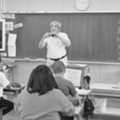教室でフラッシュを使って友達同士で2枚撮影。画像がすぐ見られない歯がゆさからか、戸惑いの会話がでた。先生の希望で小学校の思い出になる様な所で一カ所撮影をして、自由に校庭で合計5枚撮影。遊具に登ったり地面に座り込んだり、思い思いの撮影風景。残りのフィルムは夏休みの宿題。3カ月過ぎてからの2回目、一人2分程度で写真のエピソードを話してもらったが、想像外の写真が四切ワイドになった子から逆に私への質問となる。校長先生より、「プロの目は違う」「楽しくできた」「次回もあればいいのに」と意見をいただいた。